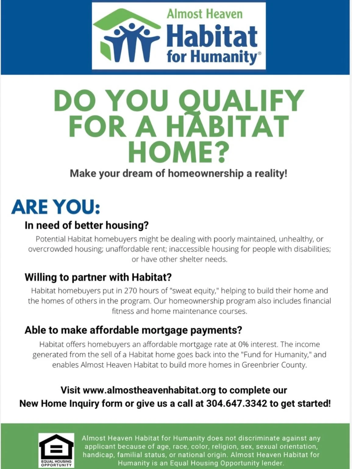 Almost Heaven Habitat for Humanity partners with people to build homes and keep communities affordable. Affordable housing is the foundation to build the life we choose, on our own terms. Inquire about our 0% interest mortgages and affordable homeownership program.